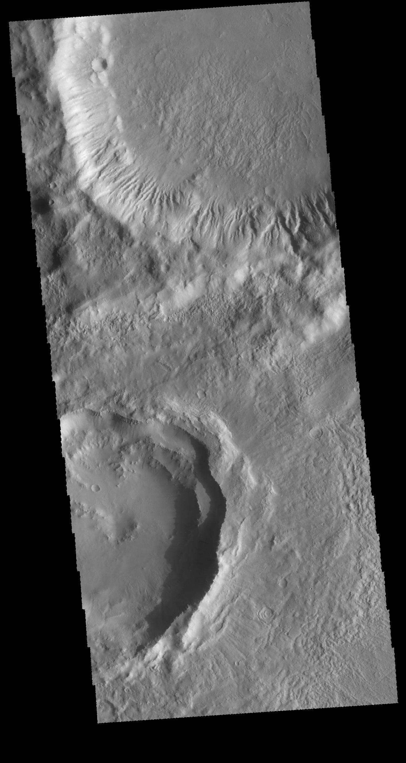 Today's VIS image shows parts of two craters located at the southern end of Tempe Fossae. There are numerous gullies dissecting the inner rim of the crater at the top of the image. Gullies are not seen in the bottom crater. In addition the crater at the top has been filled to a uniform level with material and the rim has been eroded. These features are not seen in the bottom crater, indicating that the bottom crater is relatively younger than the top crater.