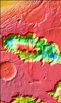 Today's VIS image crosses the entirety of Hebes Chasma, including the central rise called Hebes Mensa. Located in the center of the image, Hebes Mensa is 7.5 km (4.7 miles) tall and 120 by 43 km (75 by 27 miles) wide. The surrounding Hebes Chasma is is 319 km long (east/west, 198 miles), 130 km wide (north/south, 81miles) and up to 8km (5 miles) deep. Hebes Chasma is an inclosed basin not connected to Valles Marineris. Hebes Mensa is a large deposit of layered materials, and the cliff faces are eroding in a very different way from the Hebes Chasma cliffs.