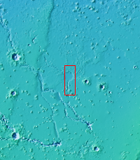 This VIS image shows a portion of Hebrus Valles. The flow of liquid (water or lava) is from the bottom of the image into the circular feature, which was likely filled by the material from the channel. The channel continues, exiting out of the circular feature to the northwest (just outside the image boundary).