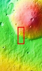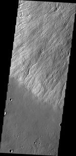 This image shows where the southwest flank of Hecates Tholus meets ground level. Hecates Tholus is one of the three major volcanoes that make up the Elysium Volcanic complex.