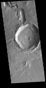 This VIS image is located in Utopia Planitia and shows part of Hephaestus Fossae. Hephaestus Fossae is a complex channel system. It has been proposed that the channel formed by the release of melted subsurface ice during the impact event that created a large crater in the center of this image. Additionally, the nearby Elysium volcanic center created subsurface heating that may have played a part in creating both Hephaestus Fossae and Hebrus Valles to the north.