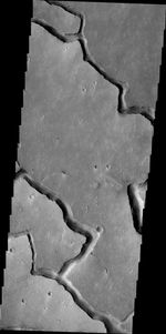 Note: this THEMIS visual image has not been radiometrically nor geometrically calibrated for this preliminary release. An empirical correction has been performed to remove instrumental effects. A linear shift has been applied in the cross-track and down-track direction to approximate spacecraft and planetary motion. Fully calibrated and geometrically projected images will be released through the Planetary Data System in accordance with Project policies at a later time.