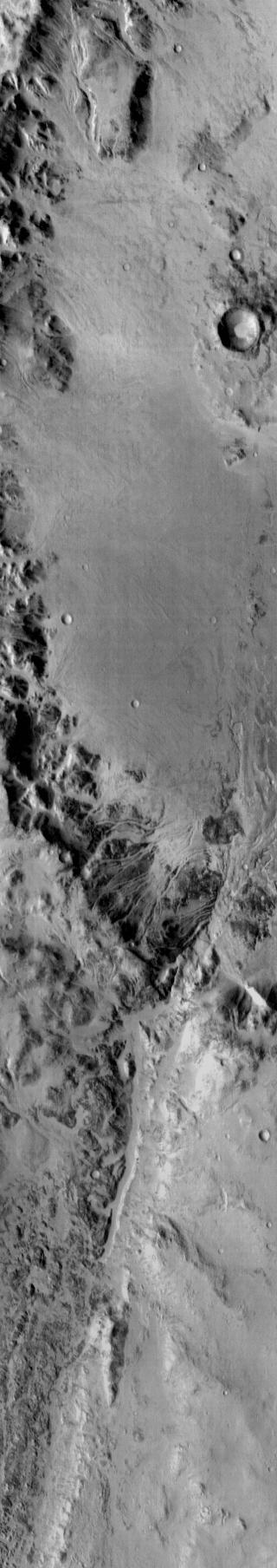 Note: this THEMIS visual image has not been radiometrically nor geometrically calibrated for this preliminary release. An empirical correction has been performed to remove instrumental effects. A linear shift has been applied in the cross-track and down-track direction to approximate spacecraft and planetary motion. Fully calibrated and geometrically projected images will be released through the Planetary Data System in accordance with Project policies at a later time.