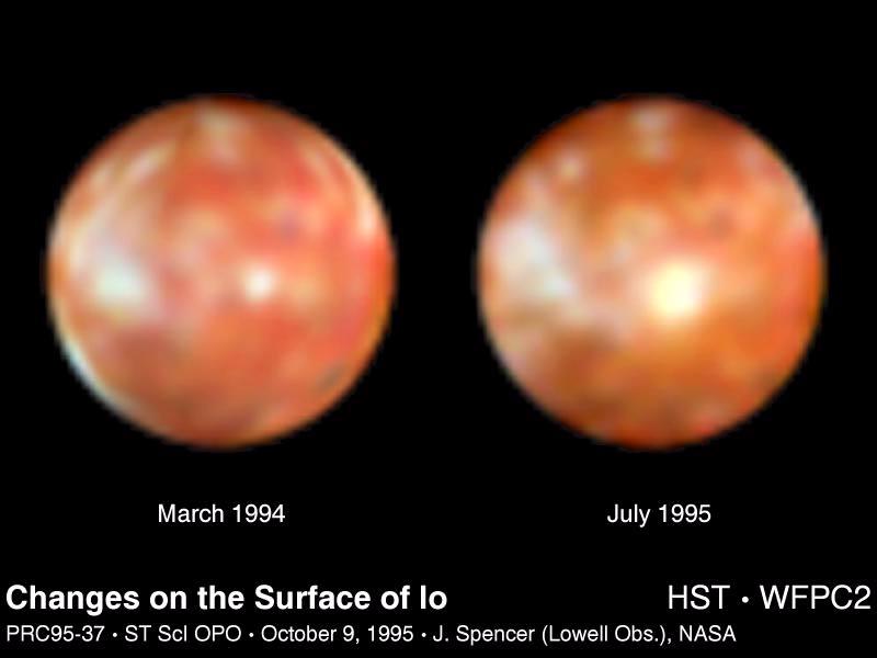 This NASA Hubble Space Telescope pair of images of Jupiter's volcanic moon Io shows the surprising emergence of a 200-mile diameter large yellowish-white feature near the center of the moon's disk (photo on the right). This is a more dramatic change in 16 months than any seen over the previous 15 years, say researchers. They suggest the spot may be a new class of transient feature on the moon. For comparison the photo on the left was taken in March 1994 -- before the spot emerged - - and shows that Io's surface had undergone only subtle changes since it was last seen close-up by the Voyager 2 probe in 1979. The new spot seen in the July 1995 Hubble image replaces a smaller whitish spot seen in about the same place in the March 1994 image. Note the much more subtle changes seen elsewhere on this face of Io over the 16 months between the images. Each image is a composite of frames taken at near-ultraviolet, violet, and yellow wavelengths, with Hubble's Wide Field and Planetary Camera 2. "The new spot surrounds the volcano Ra Patera, which was photographed by Voyager, and is probably composed of material, probably frozen gas, ejected from Ra Patera by a large volcanic explosion or fresh lava flows...," according to John Spencer of Lowell Observatory in Flagstaff, Arizona. The new bright spot is also unusual because it is much yellower than other bright regions of Io, which are whitish in color. The unusual color may result from the freshness of the deposit and will probably provide clues as to the composition of new volcanic materials on Io. The temperature on Io's surface is about -150 degrees Celsius (-238 degrees Fahrenheit); however, "hot spots" associated with volcanic activity may be as warm as 1,000 degrees Celsius (1,800 degrees Fahrenheit). Follow-up observations by Hubble, in coordination with the Galileo spacecraft, scheduled to arrive at Jupiter and fly by Io in December 1995, will reveal the evolution and lifetime of the new feature. Galileo will be able to see much greater detail on Io in visible light, but will still rely on information gleaned from Hubble UV observations and Hubble observations taken at times when Galileo cannot observe Io. These further observations should also tell whether astronomers have witnessed, for the first time, one of the processes which creates the bright regions on Io.