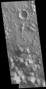 Today's VIS image shows a small section of Hydaspis Chaos, one of many regions of chaos in Margaritifer Terra. The term chaos is applied to regions where the surface is being eroded to form mesas. As the surface processes continue individual mesas become more isolated and take on the appearance of regions of hills. Hydaspis Chaos is is part of the huge outflow system flowing from Valles Marineris to Chryse Planitia.