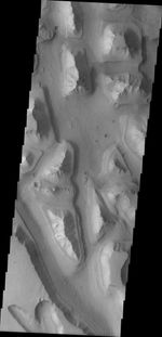 Note: this THEMIS visual image has not been radiometrically nor geometrically calibrated for this preliminary release. An empirical correction has been performed to remove instrumental effects. A linear shift has been applied in the cross-track and down-track direction to approximate spacecraft and planetary motion. Fully calibrated and geometrically projected images will be released through the Planetary Data System in accordance with Project policies at a later time.