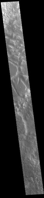 Today's VIS image shows part of Iani Chaos. Chaos terrain is typified by mesas and valleys. The initial breakup of the land is due to tectonic forces. With time and erosion the valleys widen and the mesas grow smaller. This image shows a cross section of Iani Chaos and the different scales of the mesas are readily visible.