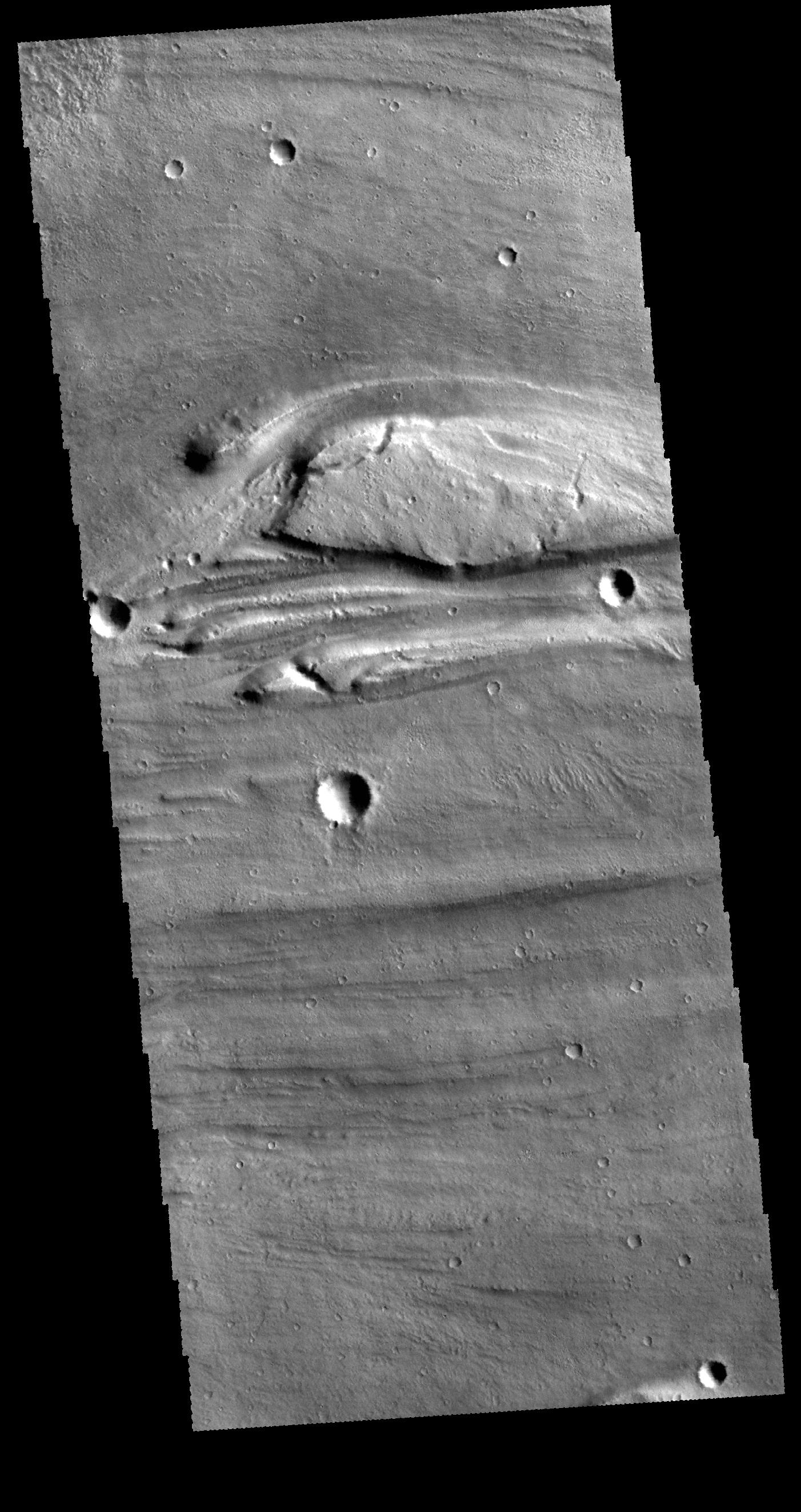 This VIS image shows a very small portion of Kasei Valles. There are several streamlined islands near the center of the image. The wider part of the island is to the left and the narrowing of the 'tail' it to the right, indicating that the flow of the liquid that formed these islands ran from west to east. These features are located near the region where Kasei Valles empties into Chryse Planitia.