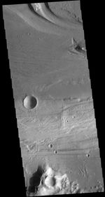This VIS image shows a portion of Kasei Valles. Kasei Valles is a large channel system that drained from the Tharsis volcanic highlands to the lower elevation Chryse Plainitia. At the top of the image is a deeper section of the channel with a tear-drop shaped central island. The direction of fluid flow is identified by the shape of the island, with the narrow "tail" on the down hill end.
