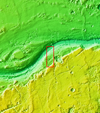 This VIS image shows secondary channeling on a terrace of the huge Kasei Valles outflow system.