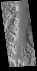 This VIS image shows a portion of Kasei Valles. In the region of this image Kasei Valles is flowing northward from Vallis Marineris. This image contains both fluvial features and tectonic features. The linear features running across the image from the lower right to the upper left are fractures created by tectonic forces. The ones running vertically were created by fluid flow. Kasei Valles is one of the largest outflow channels on Mars and catastrophic flooding carved this massive channel.