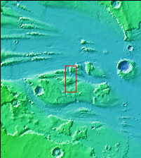 Today's VIS image shows a section of Kasei Valles. This complex channel arose in the Tharsis voclanic region and flowed eastward into Chryse Planitia. Chryse Planitia is a large circular basin, probably formed by a meteor impact.