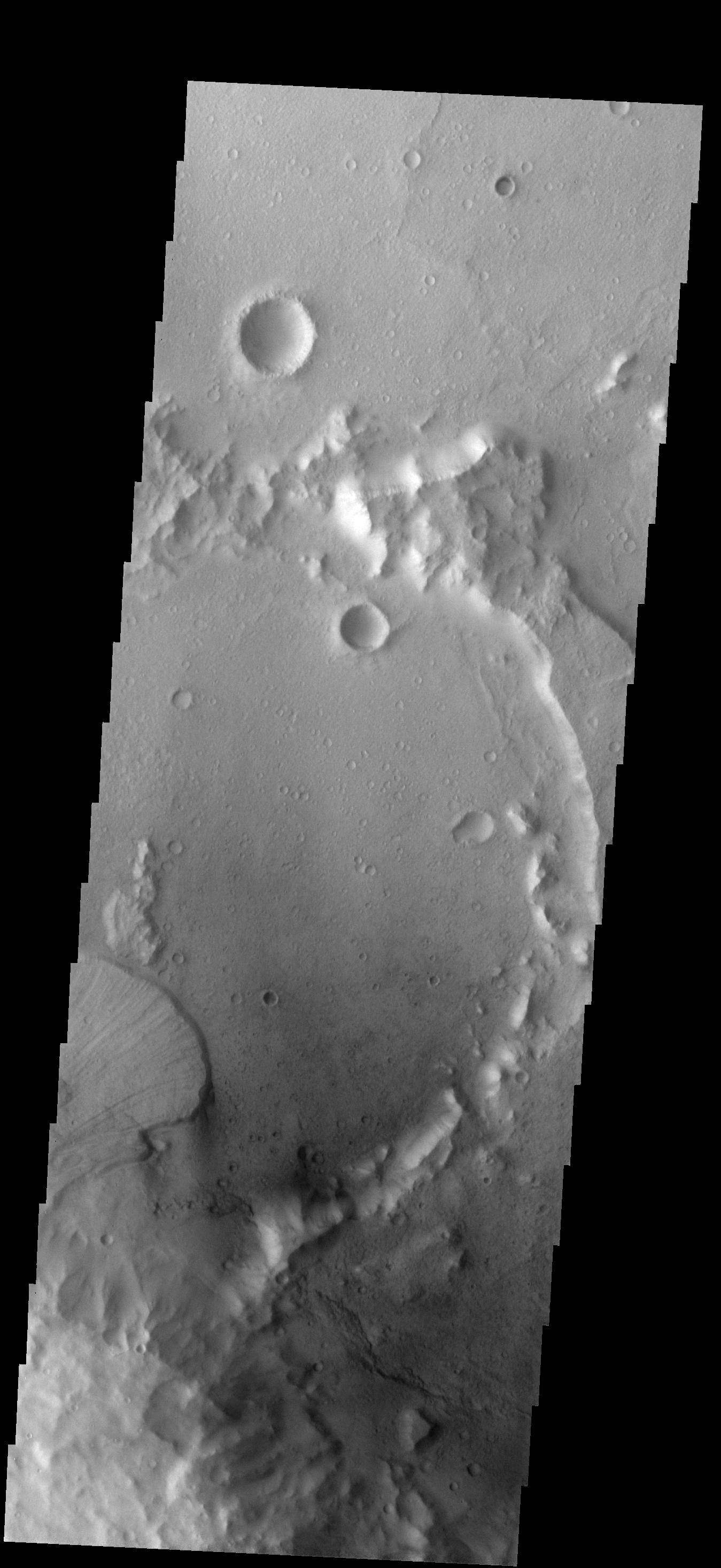 Note: this THEMIS visual image has not been radiometrically nor geometrically calibrated for this preliminary release. An empirical correction has been performed to remove instrumental effects. A linear shift has been applied in the cross-track and down-track direction to approximate spacecraft and planetary motion. Fully calibrated and geometrically projected images will be released through the Planetary Data System in accordance with Project policies at a later time.