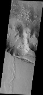 Note: this THEMIS visual image has not been radiometrically nor geometrically calibrated for this preliminary release. An empirical correction has been performed to remove instrumental effects. A linear shift has been applied in the cross-track and down-track direction to approximate spacecraft and planetary motion. Fully calibrated and geometrically projected images will be released through the Planetary Data System in accordance with Project policies at a later time.