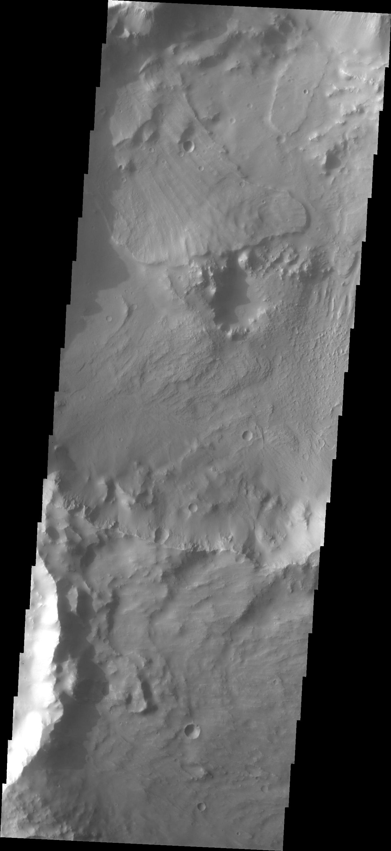 Note: this THEMIS visual image has not been radiometrically nor geometrically calibrated for this preliminary release. An empirical correction has been performed to remove instrumental effects. A linear shift has been applied in the cross-track and down-track direction to approximate spacecraft and planetary motion. Fully calibrated and geometrically projected images will be released through the Planetary Data System in accordance with Project policies at a later time.