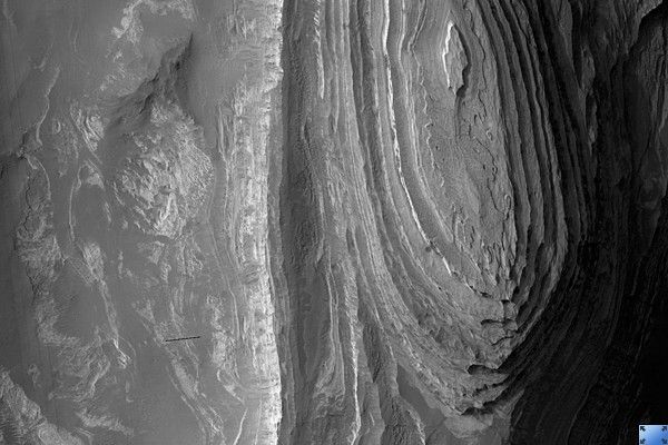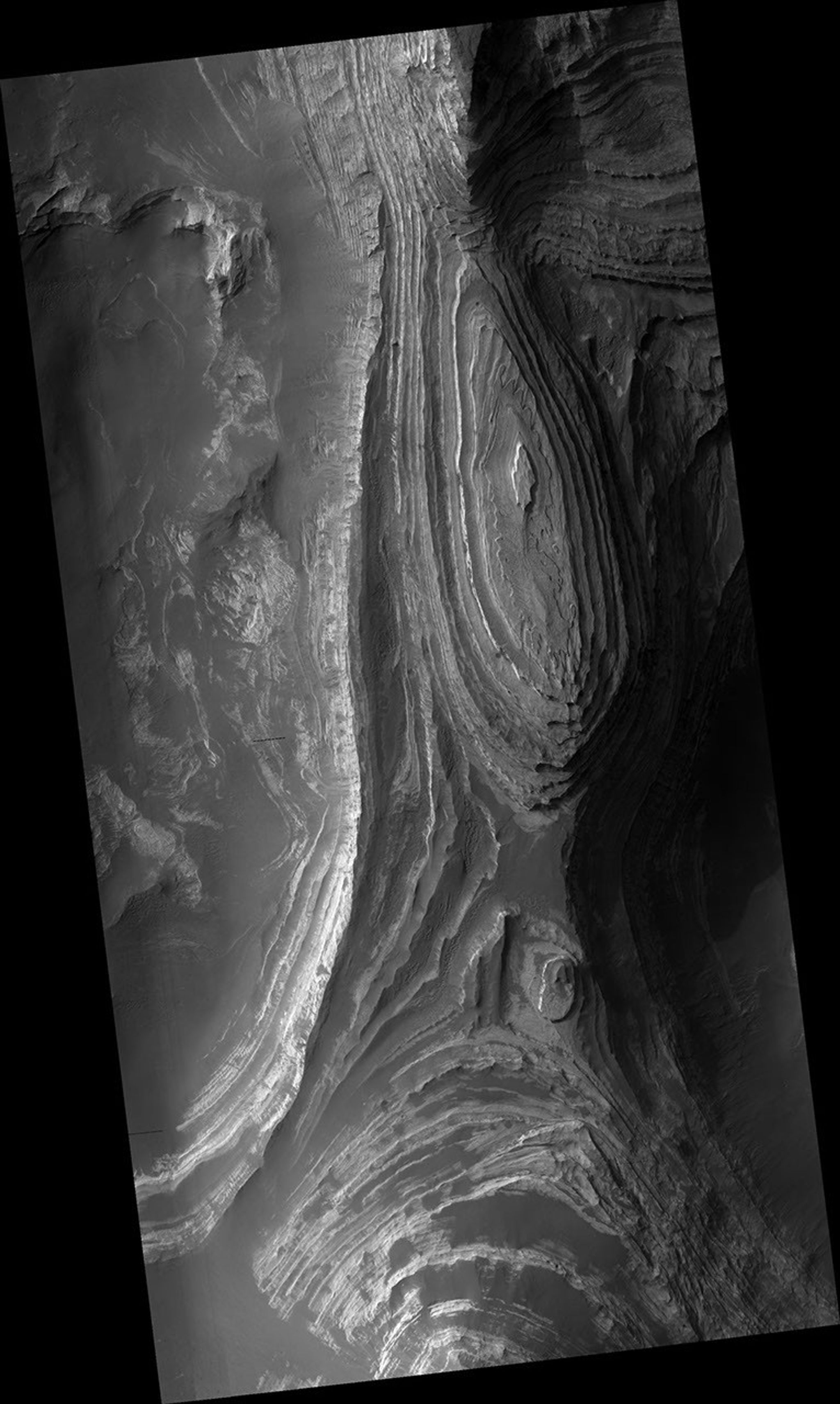 This HiRISE image (PSP_001596_1525) shows a sequence of predominantly light-toned, layered, sedimentary rocks exposed by erosion on the floor of Terby Crater. Terby Crater is ~165 kilometers (~100 miles) in diameter. It's located on the northern rim of the Hellas impact basin in the southern hemisphere of Mars.