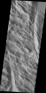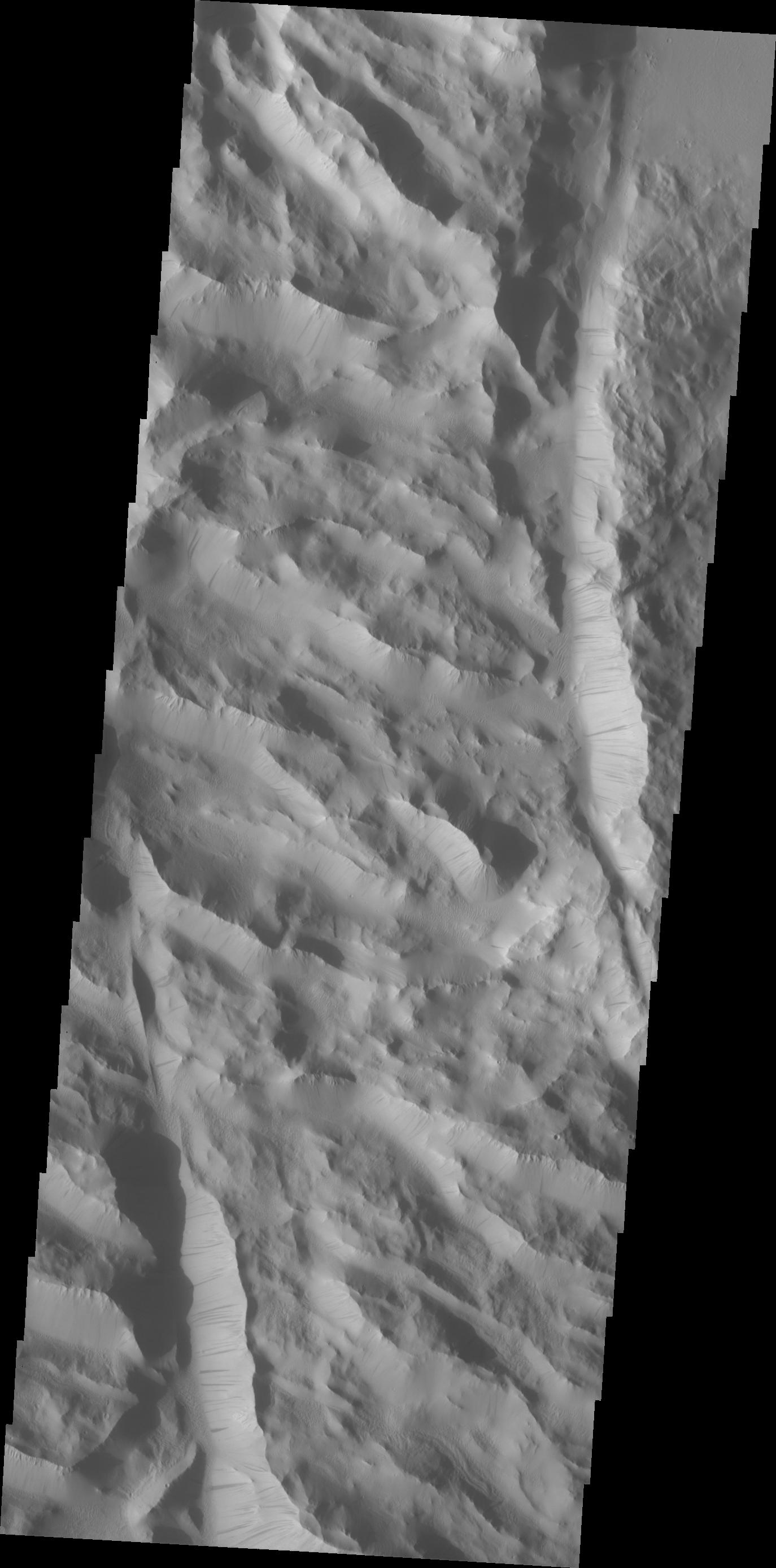 Dark slope steaks mark the ridges of this region in Lycus Sulci.