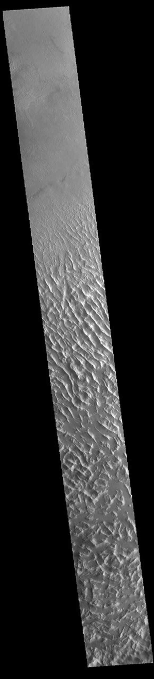 Lycus Sulci is a low lying area of ridges and valleys found to the northwest of Olympus Mons. It is not yet understood how this feature formed or how it relates to the formation of Olympus Mons itself. This VIS image shows the ridge forms that are typical of this region.