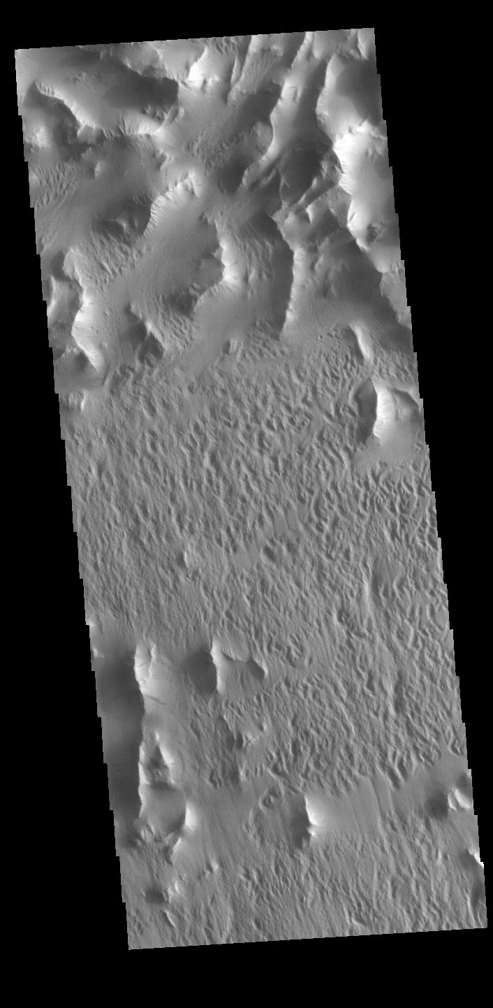Lycus Sulci is a low lying area of ridges and valleys found to the northwest of Olympus Mons. It is not yet understood how this feature formed or how it relates to the formation of Olympus Mons itself. This VIS image shows the ridge forms that are typical of this region.