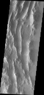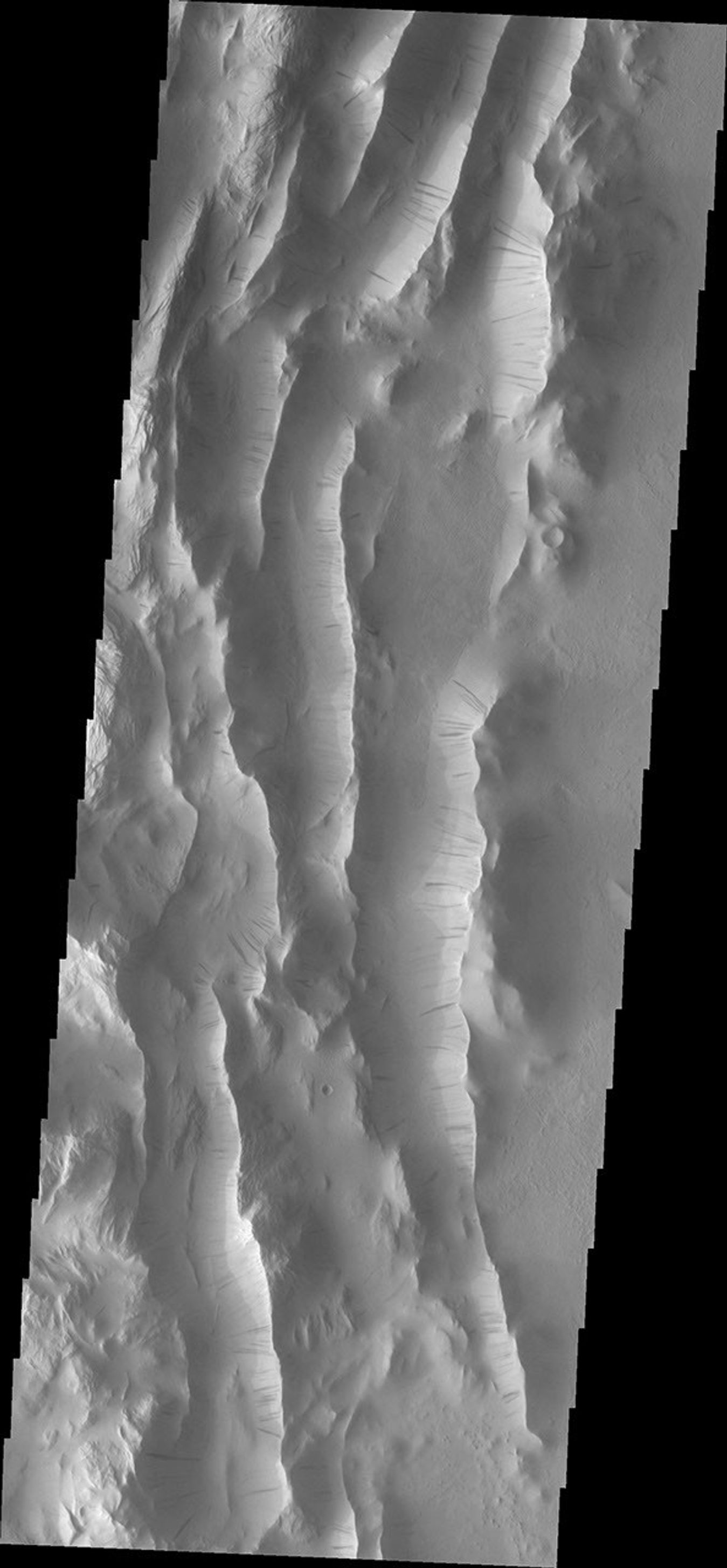 This VIS image shows a small portion of the Lycus Sulci region that surrounds Olympus Mons on its north and western flanks. The ridges of the Sulci host numerous dark slope streaks.