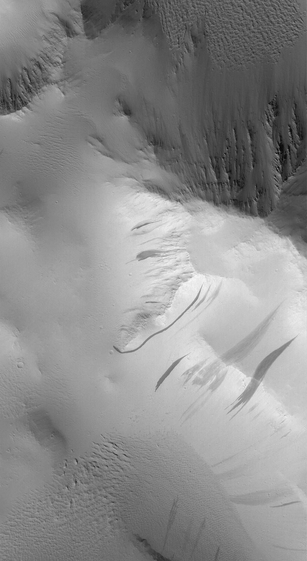 This Mars Global Surveyor (MGS) Mars Orbiter Camera (MOC) image shows dark slope streaks formed on dust-mantled mountains of the Lycus Sulci region, west of the giant volcano, Olympus Mons. Despite their fluid-like appearance, dark slope streaks form in very dry dust.