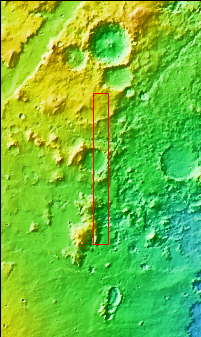 The linear depressions in today's VIS image are part of Nili Fossae. Nili Fossae is a collection of curved faults and down-dropped blocks of crust between the faults called graben. Graben are formed by extension of the crust and faulting. When large amounts of pressure or tension are applied to rocks on timescales that are fast enough that the rock cannot respond by deforming, the rock breaks along faults. In the case of a graben, two parallel faults are formed by extension of the crust and the rock in between the faults drops downward into the space created by the extension. The Nili Fossae graben lie northeast of the large volcano Syrtis Major and northwest of the ancient impact basin Isidis Planitia. The troughs, which can be almost 500 meters (1,600 feet) deep , make concentric curves that follow the outline of Isidis Planitia. The graben likely formed as the crust sagged under the weight of lava flows filling the Isidis Planitia impact basin.