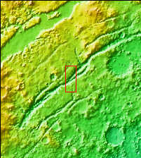 Nili Fossae is a large band of parallel graben located to the northeast of Syrtis Major. The graben in this VIS image were formed by tectonic activity, with faulting that creates the linear depression.