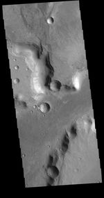 The channels in this VIS image are part of Nili Fossae. Nili Fossae is a collection of curved faults and down-dropped blocks of crust between the faults (called graben). The graben lie northeast of the large volcano Syrtis Major and northwest of the ancient impact basin Isidis Planitia. The graben make concentric curves that follow the outline of Isidis Planitia; the faults likely formed as the crust sagged under the weight of lava flows filling the Isidis basin.