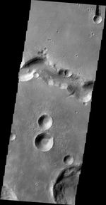 Note: this THEMIS visual image has not been radiometrically nor geometrically calibrated for this preliminary release. An empirical correction has been performed to remove instrumental effects. A linear shift has been applied in the cross-track and down-track direction to approximate spacecraft and planetary motion. Fully calibrated and geometrically projected images will be released through the Planetary Data System in accordance with Project policies at a later time.