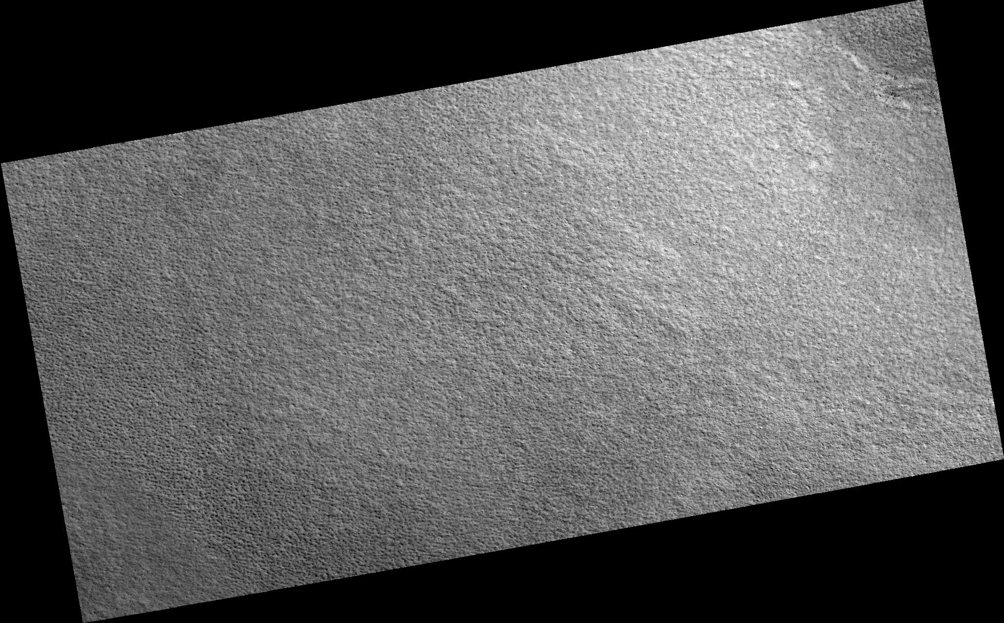 Image PSP_001417_2510 was taken by the High Resolution Imaging Science Experiment (HiRISE) camera onboard the Mars Reconnaissance Orbiter spacecraft on November 14, 2006. The complete image is centered at 71.0 degrees latitude, 260.0 degrees East longitude. The range to the target site was 313.9 km (196.2 miles). At this distance the image scale is 31.4 cm/pixel (with 1 x 1 binning) so objects ~94 cm across are resolved. The image shown here has been map-projected to 25 cm/pixel. The image was taken at a local Mars time of 2:57 PM and the scene is illuminated from the west with a solar incidence angle of 60 degrees, thus the sun was about 30 degrees above the horizon. At a solar longitude of 135.5 degrees, the season on Mars is Northern Summer.