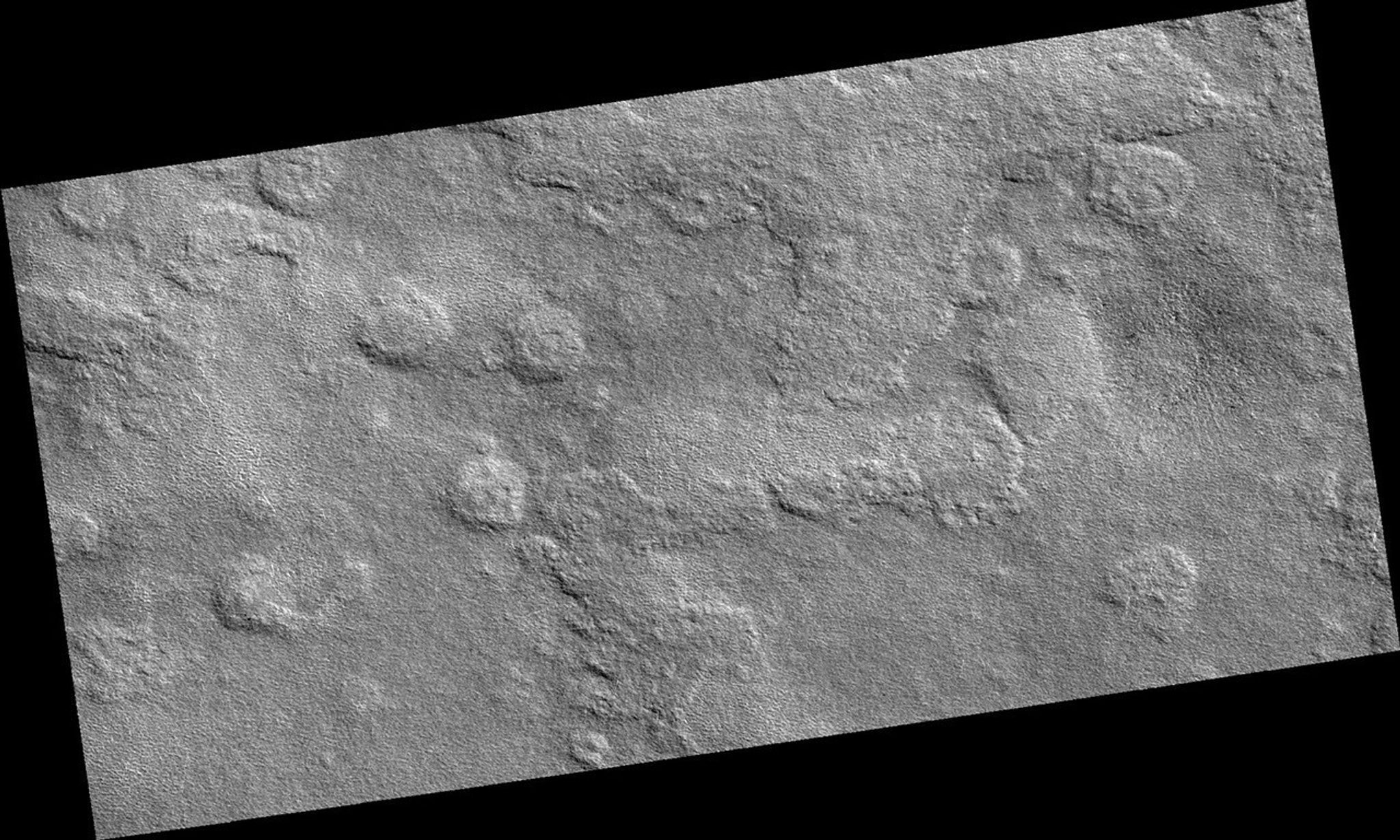 Image PSP_001483_2465 was taken by the High Resolution Imaging Science Experiment (HiRISE) camera onboard the Mars Reconnaissance Orbiter spacecraft on November 20, 2006. The complete image is centered at 66.5 degrees latitude, 262.3 degrees East longitude. The range to the target site was 311.6 km (194.8 miles). At this distance the image scale is 31.2 cm/pixel (with 1 x 1 binning) so objects ~94 cm across are resolved. The image shown here has been map-projected to 25 cm/pixel. The image was taken at a local Mars time of 3:07 PM and the scene is illuminated from the west with a solar incidence angle of 59 degrees, thus the sun was about 31 degrees above the horizon. At a solar longitude of 138.0 degrees, the season on Mars is Northern Summer.