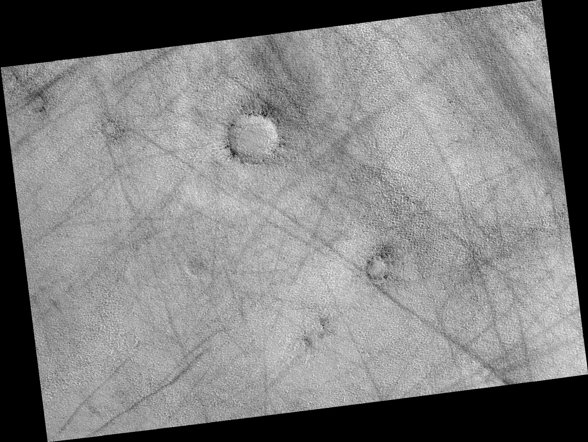 Image PSP_001477_2470 was taken by the High Resolution Imaging Science Experiment (HiRISE) camera onboard the Mars Reconnaissance Orbiter spacecraft on November 19, 2006. The complete image is centered at 67.0 degrees latitude, 67.1 degrees East longitude. The range to the target site was 313.7 km (196.0 miles). At this distance the image scale is 31.4 cm/pixel (with 1 x 1 binning) so objects ~94 cm across are resolved. The image shown here has been map-projected to 25 cm/pixel. The image was taken at a local Mars time of 3:12 PM and the scene is illuminated from the west with a solar incidence angle of 59 degrees, thus the sun was about 31 degrees above the horizon. At a solar longitude of 137.8 degrees, the season on Mars is Northern Summer.