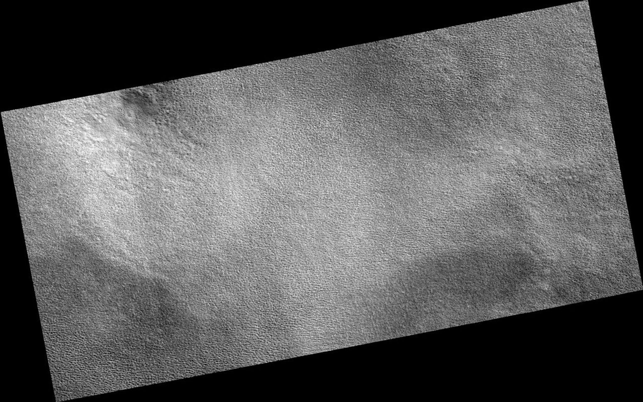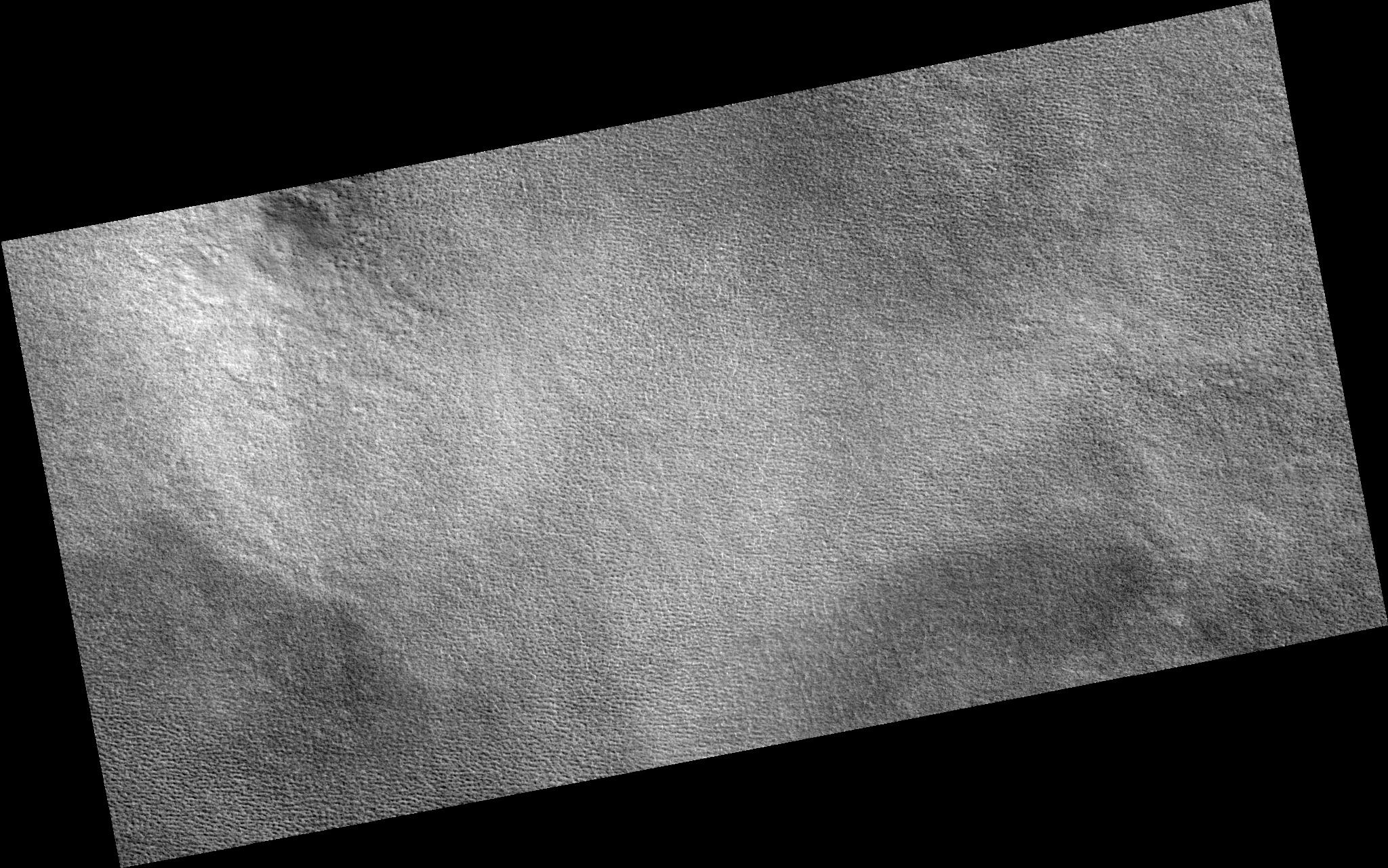 Image PSP_001351_2490 was taken by the High Resolution Imaging Science Experiment (HiRISE) camera onboard the Mars Reconnaissance Orbiter spacecraft on November 9, 2006. The complete image is centered at 69.0 degrees latitude, 260.0 degrees East longitude. The range to the target site was 315.3 km (197.1 miles). At this distance the image scale is 31.5 cm/pixel (with 1 x 1 binning) so objects ~95 cm across are resolved. The image shown here has been map-projected to 25 cm/pixel. The image was taken at a local Mars time of 2:54 PM and the scene is illuminated from the west with a solar incidence angle of 58 degrees, thus the sun was about 32 degrees above the horizon. At a solar longitude of 133.0 degrees, the season on Mars is Northern Summer.