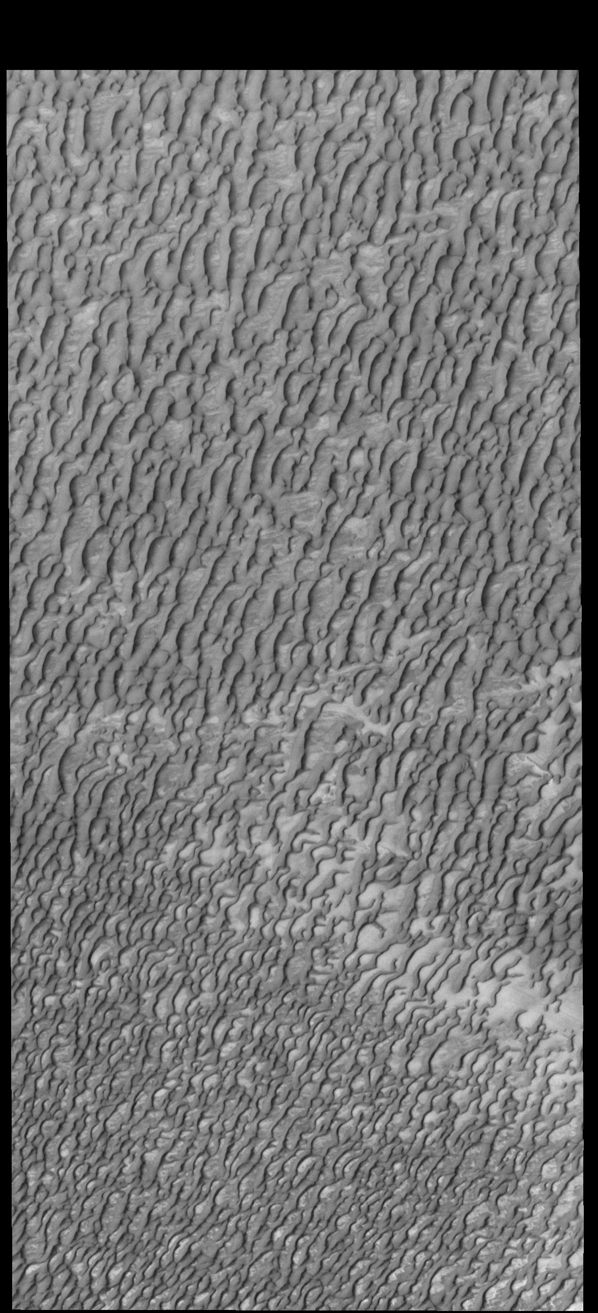 Today's VIS image shows a small portion of Olympia Undae, a huge dune field that surrounds part of the north polar cap. This image was taken during summer and there is no frost on the dune forms.