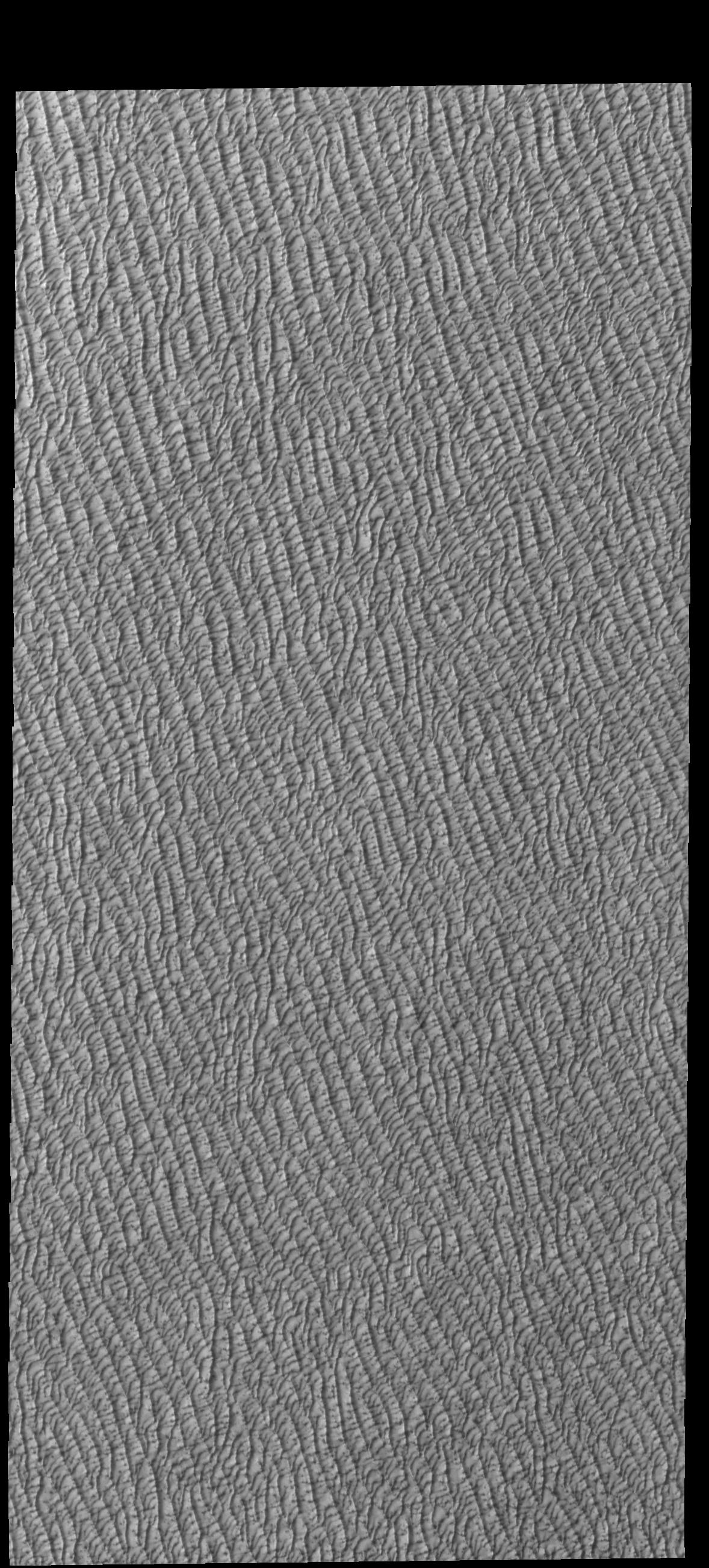 Today's VIS image shows a small portion of Olympia Undae. Olympia Undae is a large dune field that dominates the plains along part of the north polar cap. This image was collected during the northern summer season.