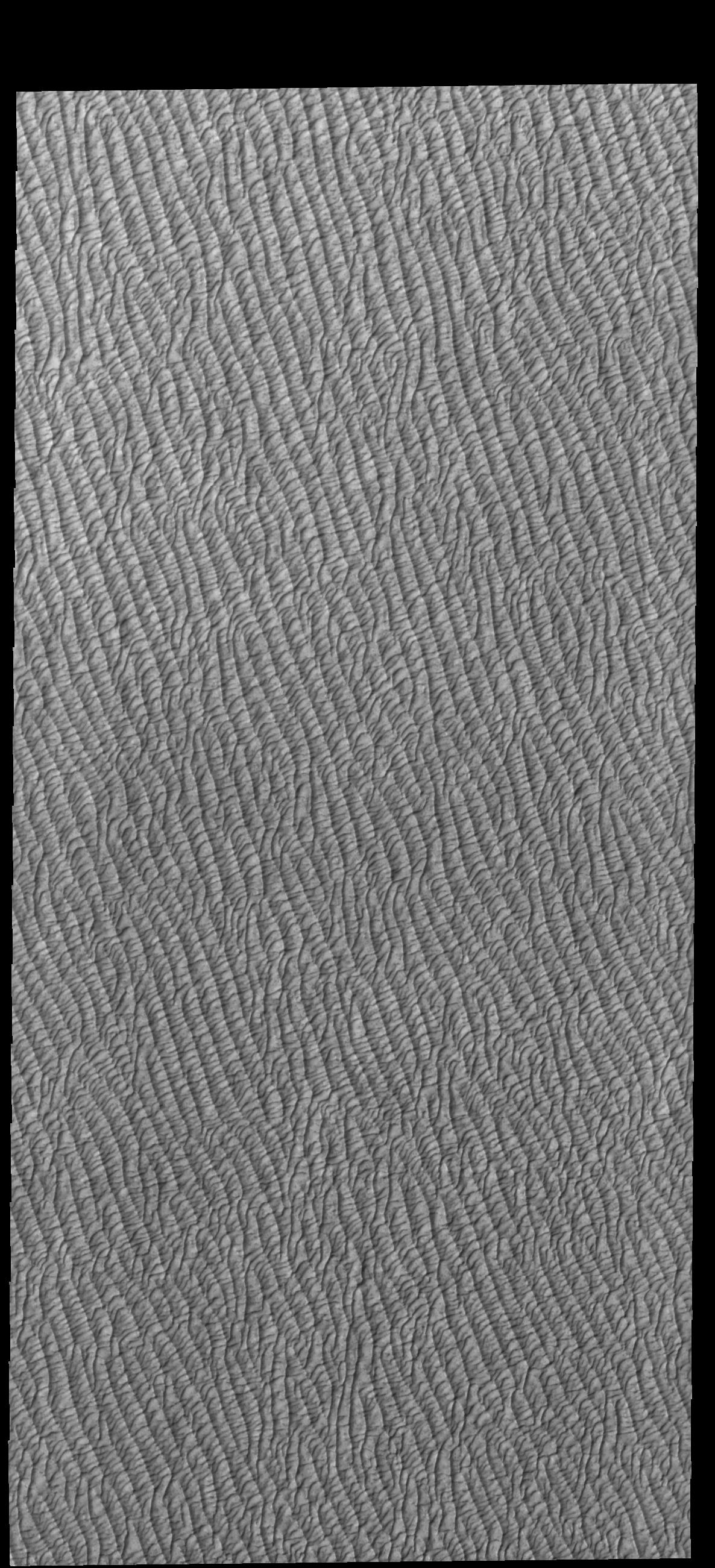 Today's VIS image shows part of Olympia Undae, the largest of several dune fields that encircle the north polar cap. This image was collected in the spring season.