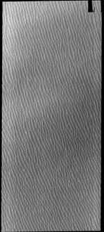 Today's VIS image shows a small portion of Olympia Undae. Olympia Undae is a large dune field that dominates the plains along part of the north polar cap. This dune field surrounds 1/3 of the north polar cap and is the largest of several dune fields that encircle the pole. This VIS image was collected during summer. It is during this season that winds are able to move sand sized particles, slowly modifying the dunes.
