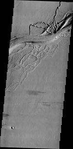 Today's VIS image shows a complex region of channels in Tharsis. Called Olympica Fossae, these channel forms were created by lava flows rather than water.