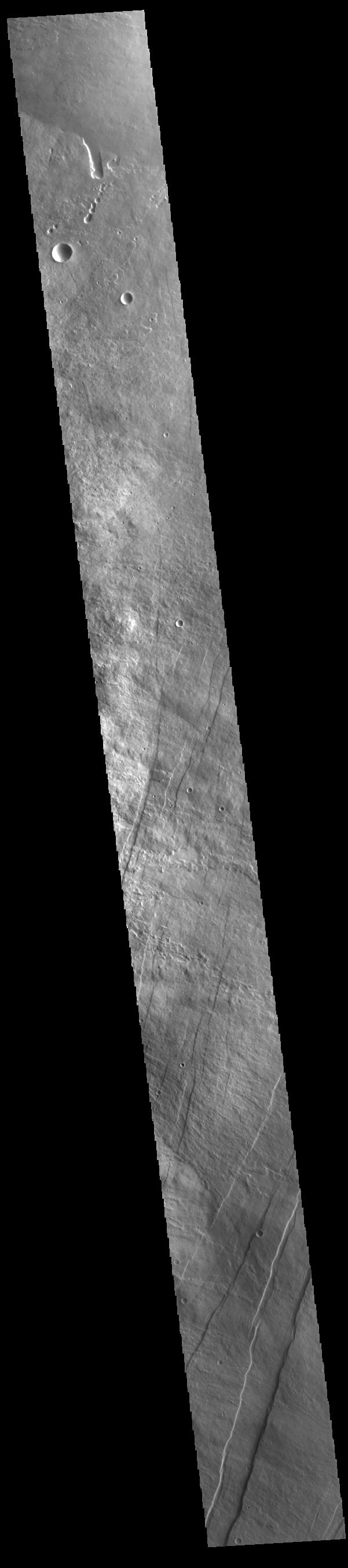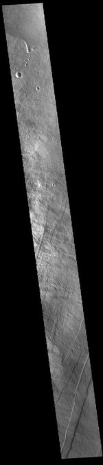 The linear features in the bottom half of this VIS image are called Oti Fossae. Oti Fossae is located on the eastern flank of Arsia Mons and aligns with the regional northeast/southwest trend of the major Tharsis volcanoes. Fossae are typically tectonic features termed graben. Graben are formed by extension of the crust and faulting. When large amounts of pressure or tension are applied to rocks on timescales that are fast enough that the rock cannot respond by deforming, the rock breaks along faults. In the case of a graben, two parallel faults are formed by extension of the crust and the rock in between the faults drops downward into the space created by the extension. The crustal deformation in this region was from the inflation of the surface by the rise of magma that created the Tharsis volcanoes.