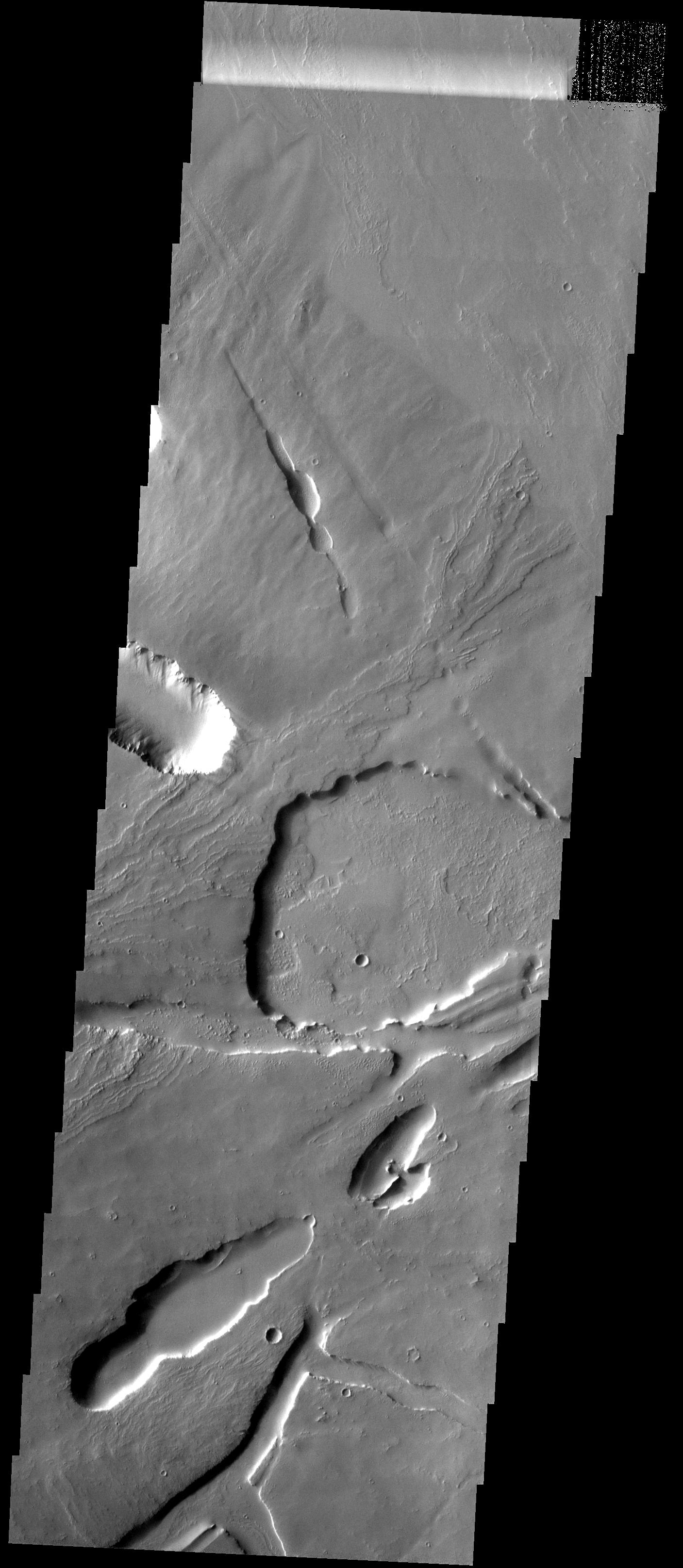This images shows part of the northeastern flank and margin of Pavonis Mons on Mars. Collapse features are common on the margins of the Tharsis volcanoes along the vent axis as seen by NASA's 2001 Mars Odyssey spacecraft.