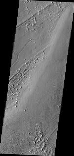 Pavonis Mons, one of the three huge Tharsis volcanoes, is encircled on the west side by a series of arcuate ridges. How these features were formed is still unknown.