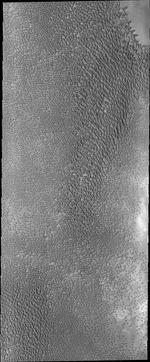 This VIS image shows part of a dune field near the north polar cap. This is not Olympia Undae, the largest dune field near the north polar cap, but is rather a portion of a smaller dune field further to the east.