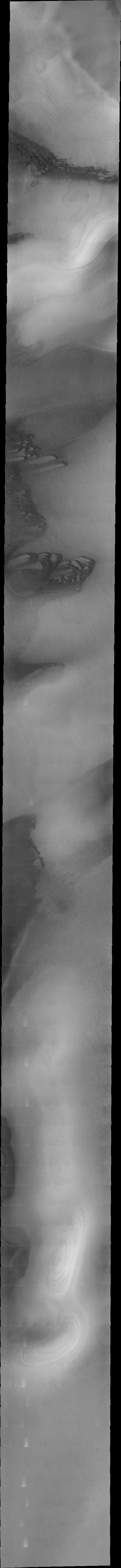 The dark sand dunes in this VIS image are located on the South Polar cap near Reynolds Crater.