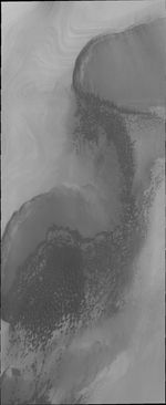 Sand dunes form large fields, called ergs, around the north polar cap of Mars. This image shows are region of dunes at the cap margin.