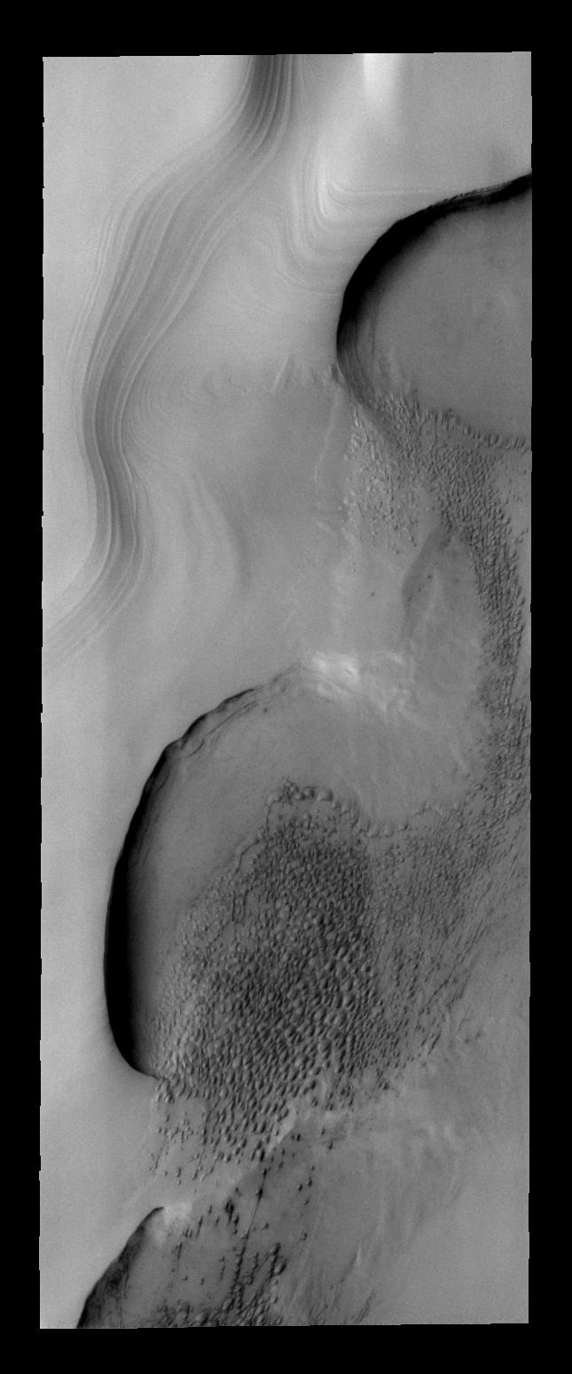Note: this THEMIS visual image has not been radiometrically nor geometrically calibrated for this preliminary release. An empirical correction has been performed to remove instrumental effects. A linear shift has been applied in the cross-track and down-track direction to approximate spacecraft and planetary motion. Fully calibrated and geometrically projected images will be released through the Planetary Data System in accordance with Project policies at a later time.