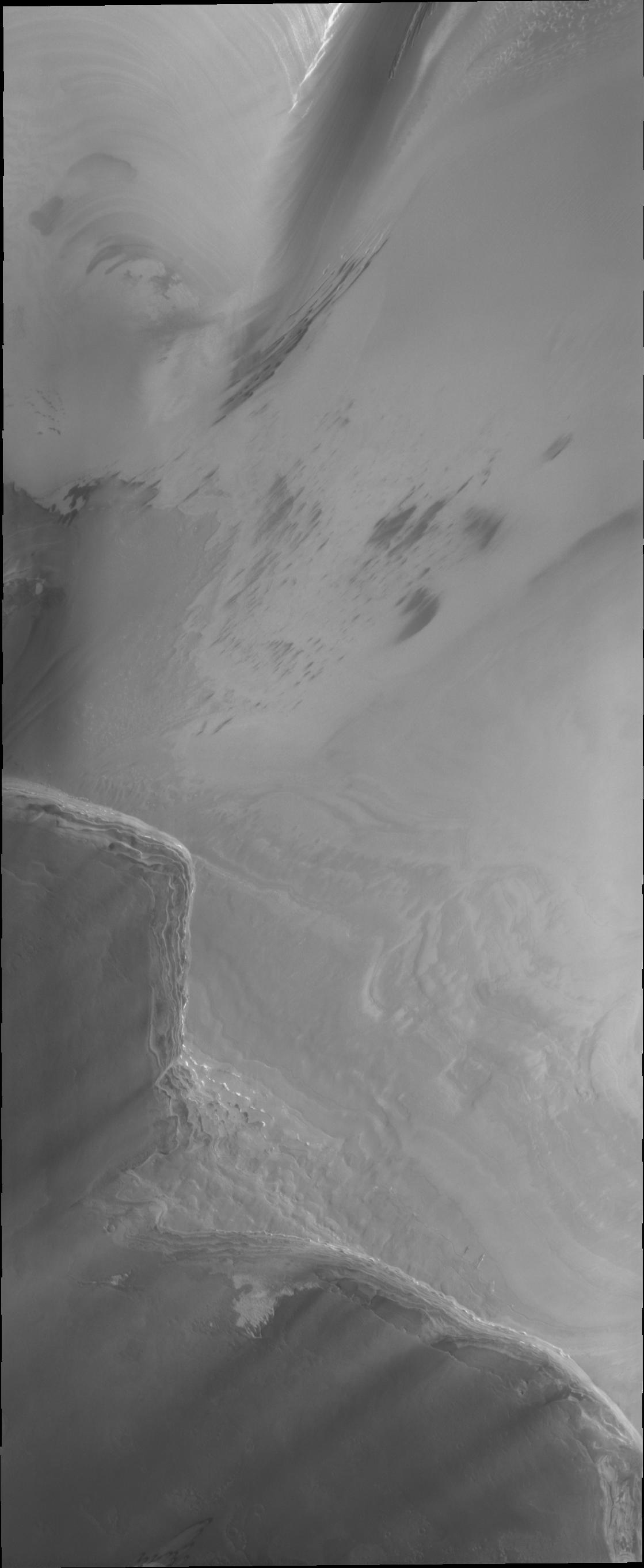 Sand dunes form large fields, called ergs, around the north polar cap of Mars. This image shows are region of dunes at the cap margin.