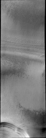 Note: this THEMIS visual image has not been radiometrically nor geometrically calibrated for this preliminary release. An empirical correction has been performed to remove instrumental effects. A linear shift has been applied in the cross-track and down-track direction to approximate spacecraft and planetary motion. Fully calibrated and geometrically projected images will be released through the Planetary Data System in accordance with Project policies at a later time.