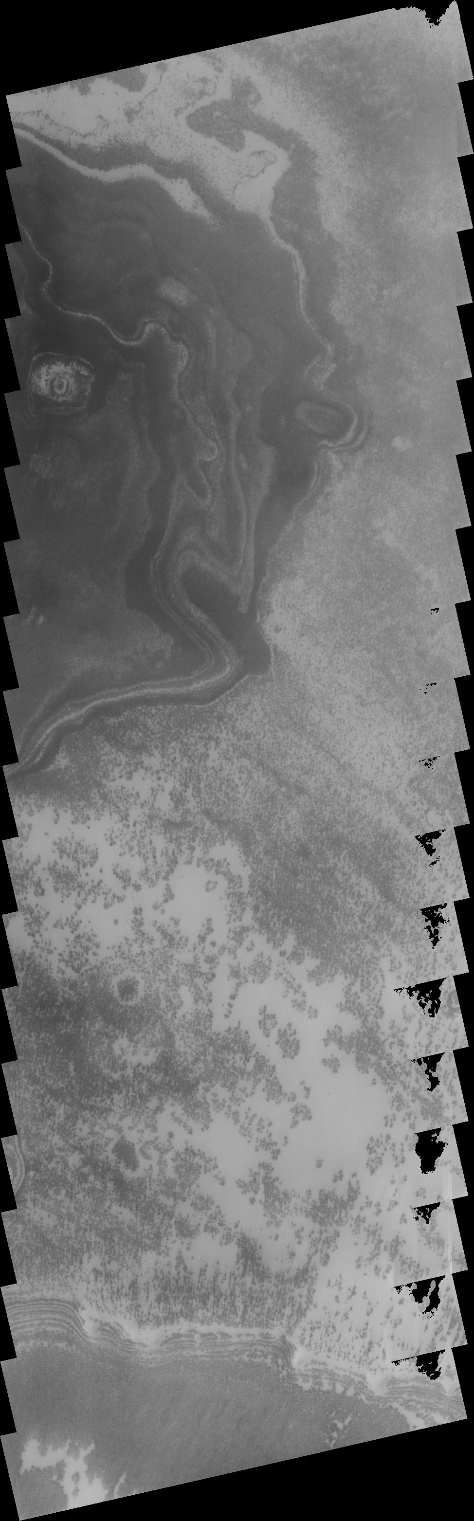 This image shows just one example of the bright and dark markings that appear during summer time. The marks are related to the polar layers. If you happen to see a wild-eyed guy sticking his tongue out at you, you'll know why this image qualifies for the old "art" category of THEMIS releases.