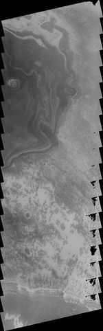 Note: this THEMIS visual image has not been radiometrically nor geometrically calibrated for this preliminary release. An empirical correction has been performed to remove instrumental effects. A linear shift has been applied in the cross-track and down-track direction to approximate spacecraft and planetary motion. Fully calibrated and geometrically projected images will be released through the Planetary Data System in accordance with Project policies at a later time.