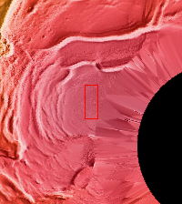 This VIS image shows part of the South Polar cap. In this region the surface has numerous circular depressions, which give the appearance of a slice of swiss cheese.